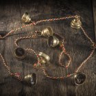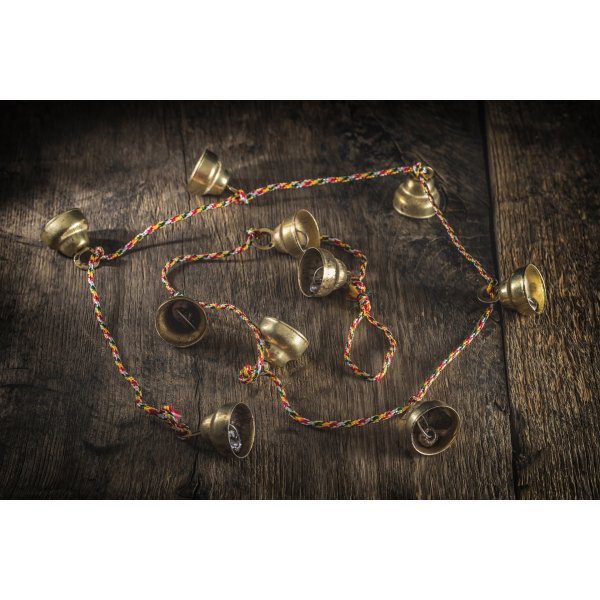 10szt dzwoneczków umieszczonych na kolorowym sznurku o długości 100 cm (posiada oczko umożliwiające powieszenie).