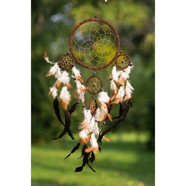 Łapacz snów wykonany jest z piór, skóry, sznurków oraz drewnianych koralików.Amulet niektórych plemion Indian z Ameryki Północnej, obecnie także popularna nie tylko w Ameryce ozdoba o charakterze etnicznym.