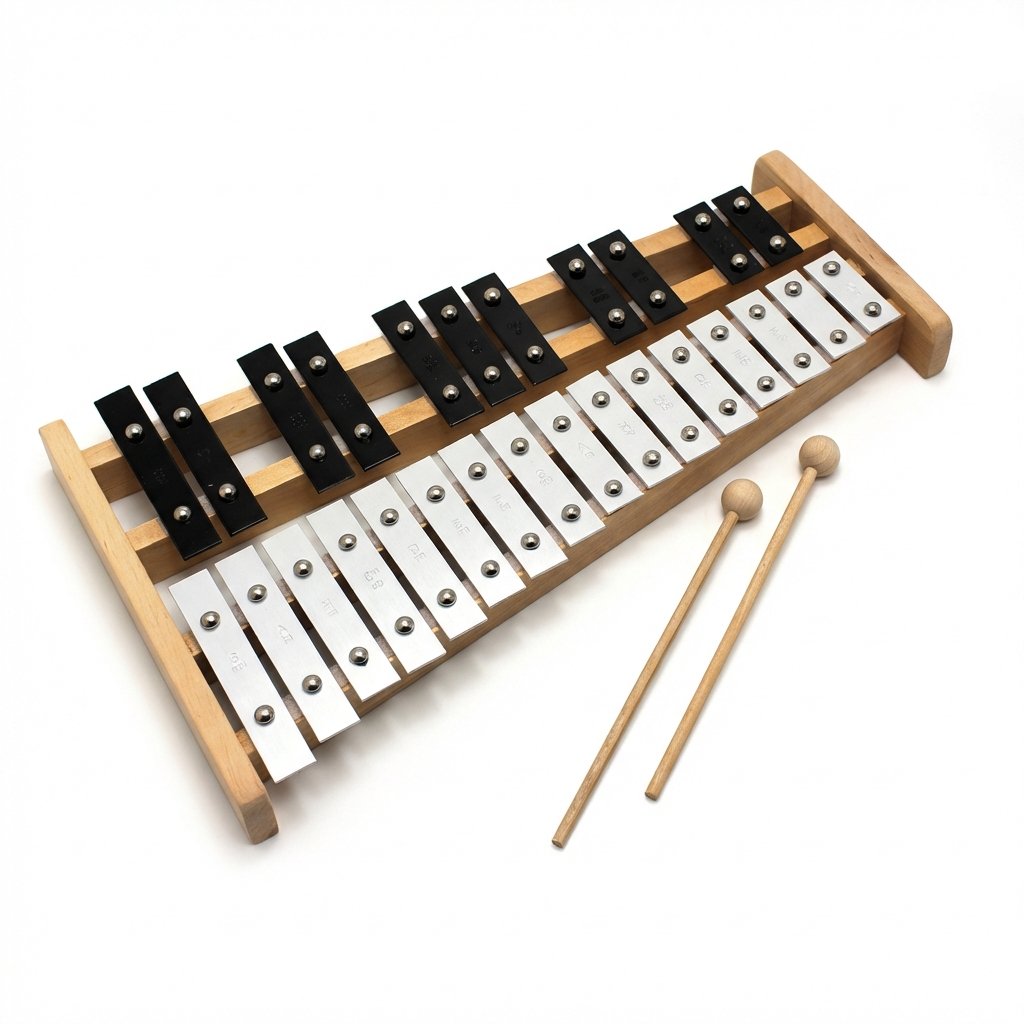 Instrument został wykonany na stabilnej, drewnianej podstawie o grubości 3 cm, co zapewnia trwałość i komfort użytkowania. Metalowe sztabki są precyzyjnie strojone elektronicznie, dzięki czemu dźwięk jest czysty i zgodny z zapisem nutowym. Oznaczenia dźwięków na każdej sztabce ułatwiają naukę oraz szybkie odnalezienie właściwego tonu.