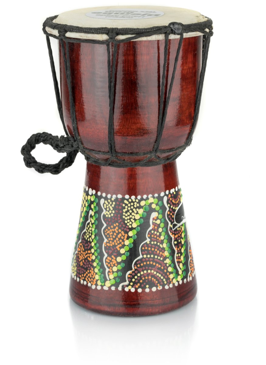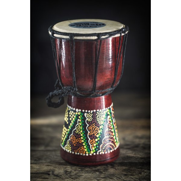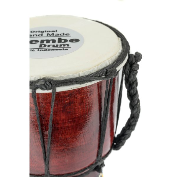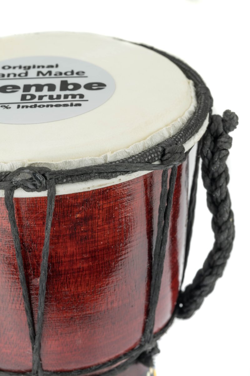 Oryginalny bębenek Djembe zachwyca nie tylko brzmieniem, ale i swoim wyglądem. Wykonany z jednego kawałka egzotycznego drewna Suar, łączy w sobie tradycyjne rzemiosło z artystycznym wykończeniem. Naturalna kozia skóra naciągnięta na mosiężnej obręczy nadaje mu głębokie, autentyczne brzmienie.