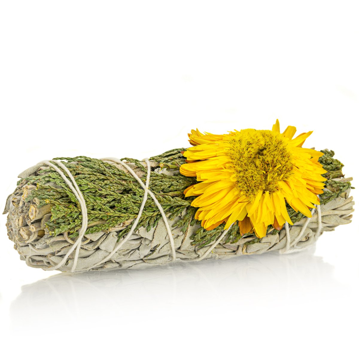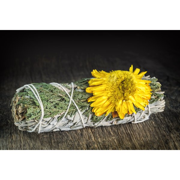Biała szałwia w kształcie walca, opleciona aromatycznym cedrem i suszoną kocanką (znaną jako „nieśmiertelnik”), to wyjątkowe połączenie ziół i kwiatów.