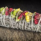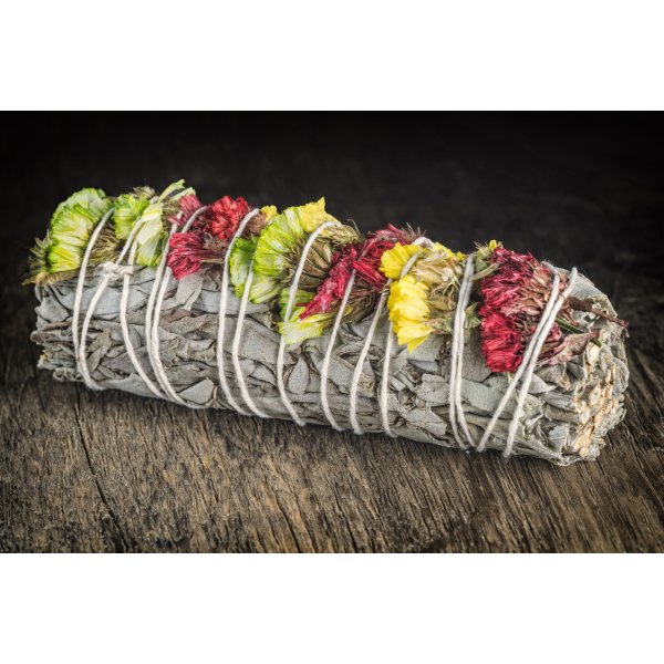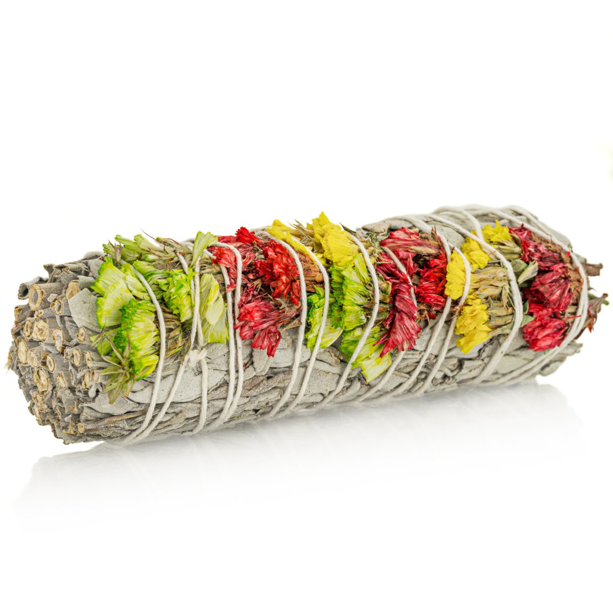 Biała szałwia w formie walca z dodatkiem kwiatów sinuaty w kolorach zielonym, czerwonym i żółtym to niezwykłe, naturalne kadzidło. Symbolizuje ogień, energię i życie (czerwony i żółty) oraz harmonię z naturą (zielony).