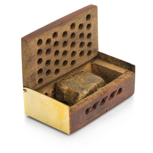Umieść szkatułkę w samochodzie, garderobie lub małym pomieszczeniu – ciepły zapach rozniesie się bez konieczności rozpalania żywicy. Piękny design żywicy sprawia, że może być doskonałym pomysłem na prezent. Małe (6 x 4 cm) drewniane pudełko zostało precyzyjnie wykonane w Indiach. Po zużyciu 5 g żywicy, może służyć jako małe puzderko na suszone zioła lub inne naturalne kadzidło. Bogaty, ziemisty zapach doskonale sprawdzi się wieczorem – zrelaksuje po całym dniu oraz ukoi nerwy.